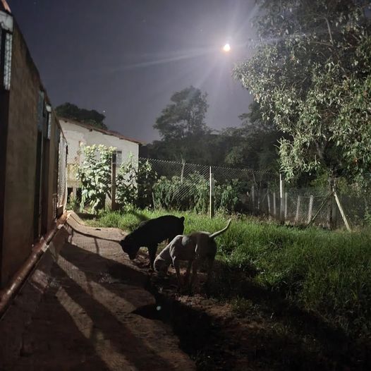 Ainda com as marcas psicológicas da vida de maus tratos, não se dão bem com outros cães, situação que esperamos que mude em breve. Por enquanto, apreciamos a bela paisagem noturna do nosso Santuário.